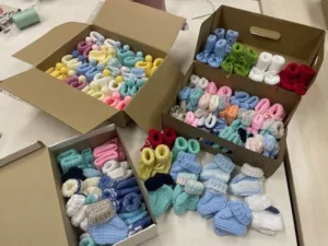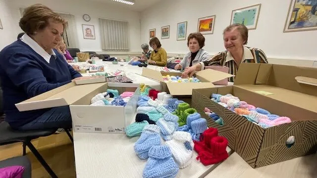 Občina Log – Dragomer, 25. marec 2026: Članice sekcije ročnih spretnosti pri Kulturno umetniškem društvu Kosec so tudi letos s svojo predanostjo in ustvarjalnostjo polepšale prve dni življenja številnim novorojenčkom. V treh mesecih skrbnega dela so izdelale približno 60 parov mehkih, ročno izdelanih copatk, namenjenih ljubljanski Porodnišnici.
