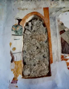Na slavoločni steni je na levi strani (za oltarjem sv. Marije Magdalene) ohranjen fragment prizora Jezusovega rojstva. Na notranji strani slavoloka je fragment Kristusa Sodnika, ohranjen le v delu obraza z manjšim segmentom mandorle. Njena prvotna velikost bi presegala sedanjo širino loka, kar kaže na kasnejše arhitekturne spremembe. Levo je upodobljen angel s trobento, desno pa duše v raju (Abrahamovo naročje).