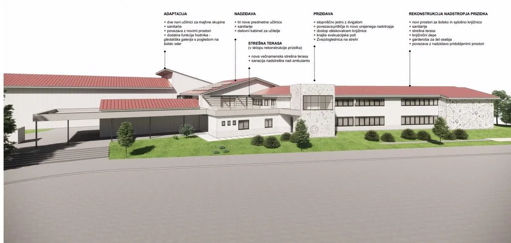 Skupna neto tlorisna površina znaša 971,3 m², od tega bo 595,5 m² rekonstrukcije in 375,8 m² novogradnje. Z investicijo bodo pridobljene tri nove učilnice, trije kabineti za individualno delo, šolska knjižnica s čitalnico, nove sanitarije ter del prostorov, namenjen splošni knjižnici. Cilj projekta je zagotoviti ustrezne prostorske pogoje za kakovostno izvajanje pouka ter ustvariti sodobno, funkcionalno in udobno učno okolje.