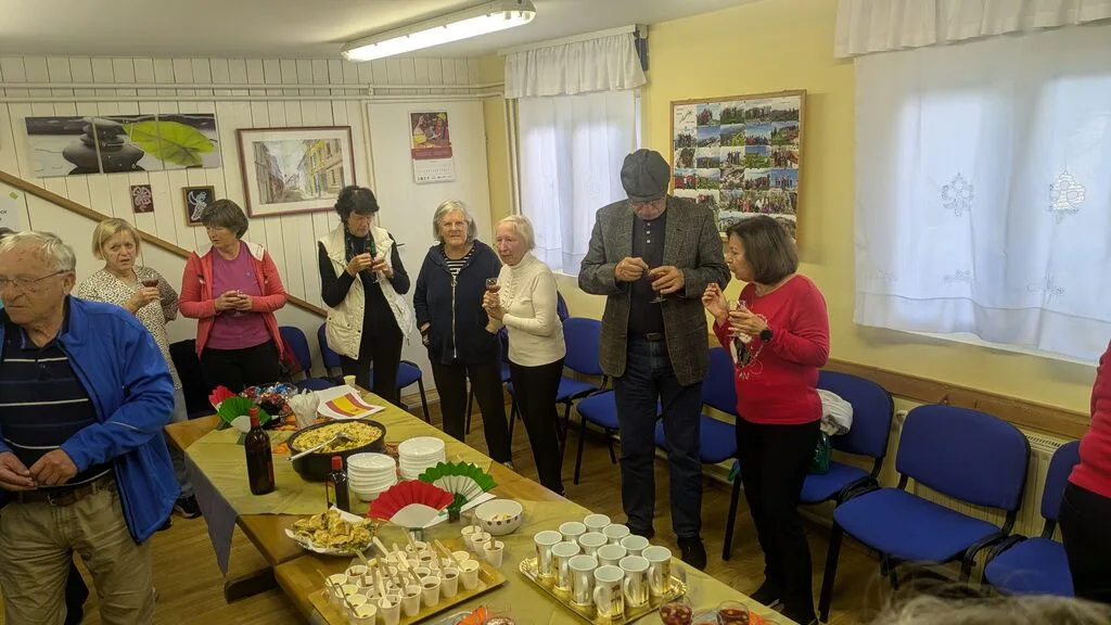 Predstavitev je bila zanimiva; barvite fotografije in Brankina slikovita pripoved so nas popeljale v srce južne Španije. Srečanje smo nadaljevali ob prijetnem druženju in klepetu, andaluzijski utrip pa je napolnil prostor s španskimi vonjavami. Rafka nam je pripravila okusno paelo, s sladico flan in kozarčkom osvežilne sangrije pa nas je pocrkljala Tanja. Pravi španski večer, poln smeha in dobrega razpoloženja, sta dopolnila tudi Drago z blitvino pito in Marička s čokoladnimi pralinami.