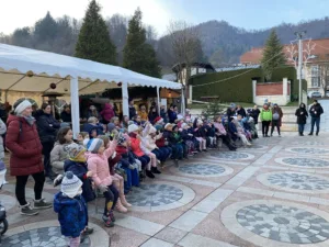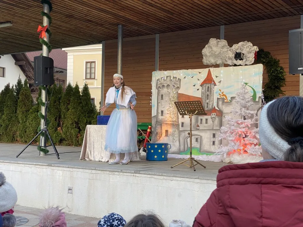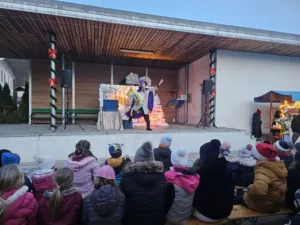 Zimska pravljica na občinskem trgu v Horjulu je dobila svoj pravi pomen z obiskom pravljične Snežne kraljice, ki se pripravlja na novoletno praznovanje in pričara celo sneg!