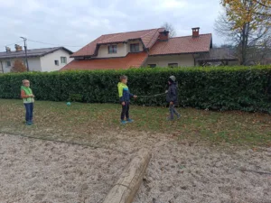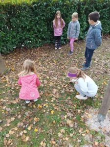 V šolskem parku in sadovnjaku  smo obiskali  njune velike prebivalce in jih poskusili poimenovati. Večina dreves je že izgubila svoj čudoviti okras barvitega listja, saj je bila letošnja pozeba zgodnja. Objeli smo ta čudovita bitja, jih otipali in vonjali,  se zazrli v njihove krošnje s čipkami drobcenih vejic, vse pa s svojo rastjo strmijo k višku, k sončevi svetlobi. Z voščenkami smo posneli odtis lubja. Učiteljice so nas naučile izmeriti višino dreves s pomočjo iz palic izdelanega gozdarskega križa. Objeli smo debla in jih z vrvico izmerili. Ugotavljali smo, kako dolgo so drevesa rastla. Pod drevesi smo nabrali odpadlo listje, ki je že izgubljalo barvo in primerjali barvne odtenke z barvicami. Našli smo toplo paleto jesenskih barv od zeleno rumene, oranžne, rdečkaste in nešteto odtenkov rjave. Prijeli smo se za roke in sklenili smo krog pod zunanjimi vejami drevesne krošnje. Poiskali smo rastline, ki rastejo na tleh v zavetju drevesne krošnje.