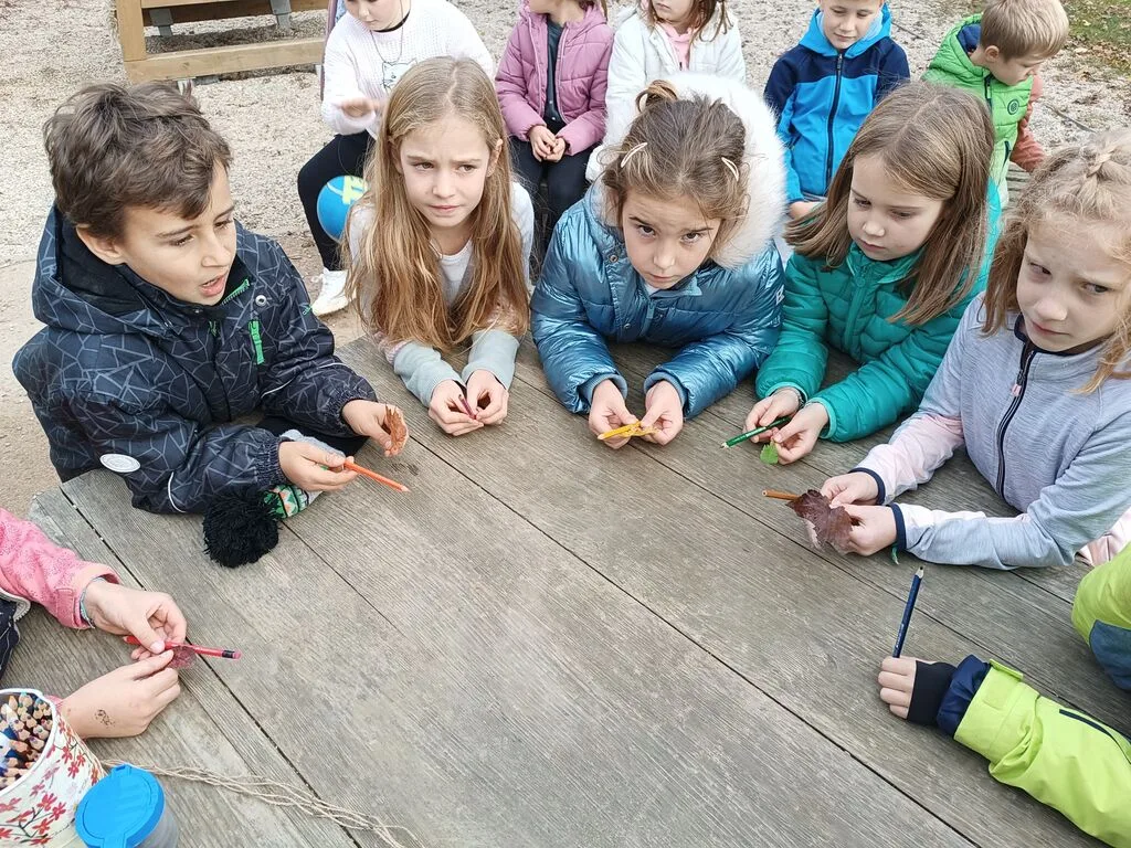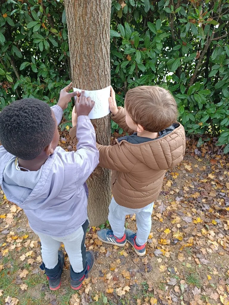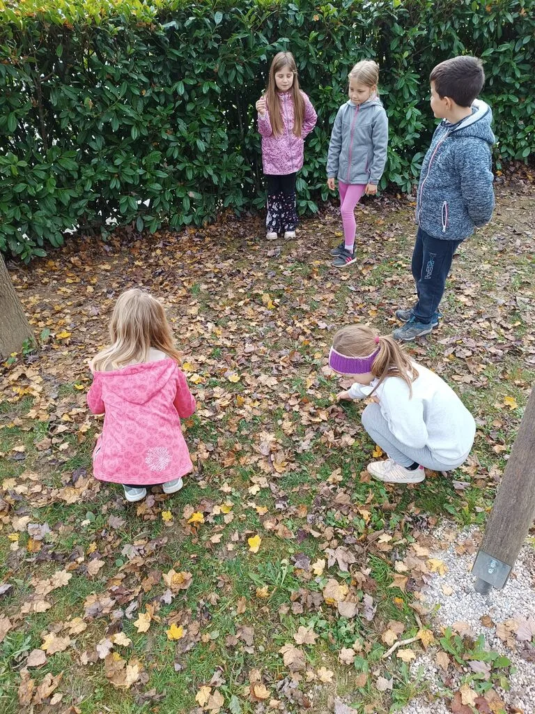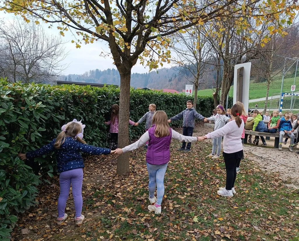 V šolskem parku in sadovnjaku  smo obiskali  njune velike prebivalce in jih poskusili poimenovati. Večina dreves je že izgubila svoj čudoviti okras barvitega listja, saj je bila letošnja pozeba zgodnja. Objeli smo ta čudovita bitja, jih otipali in vonjali,  se zazrli v njihove krošnje s čipkami drobcenih vejic, vse pa s svojo rastjo strmijo k višku, k sončevi svetlobi. Z voščenkami smo posneli odtis lubja. Učiteljice so nas naučile izmeriti višino dreves s pomočjo iz palic izdelanega gozdarskega križa. Objeli smo debla in jih z vrvico izmerili. Ugotavljali smo, kako dolgo so drevesa rastla. Pod drevesi smo nabrali odpadlo listje, ki je že izgubljalo barvo in primerjali barvne odtenke z barvicami. Našli smo toplo paleto jesenskih barv od zeleno rumene, oranžne, rdečkaste in nešteto odtenkov rjave. Prijeli smo se za roke in sklenili smo krog pod zunanjimi vejami drevesne krošnje. Poiskali smo rastline, ki rastejo na tleh v zavetju drevesne krošnje.