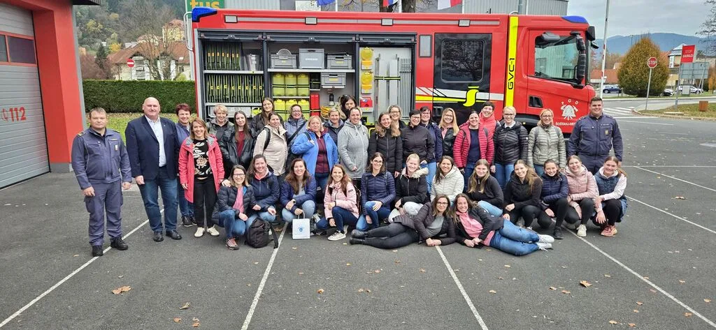 Po ogledu elektrarne smo se članice peš povzpele do Pustega gradu in od tam občudovale enega najlepših razgledov na dolino, mesto in jezera, ki so nastala zaradi ugrezanja oz. izkopavanja lignita. Nato nas je pot vodila v gasilski dom PGD Šoštanj, kjer nas je sprejel predsednik PGD Šoštanj Klemen Mežnar. Dobrodošlico nam je prišel zaželeti tudi župan Boris Goličnik, ki je poudaril pomen prostovoljnega dela in izjemnega sodelovanja med gasilci ter občino. Članice so spoznale opremo in vozila šoštanjskih gasilcev, med katerimi izstopa gasilska avtolestev – nanjo pa so se nekatere, s kančkom poguma in dobre volje, tudi same povzpele.