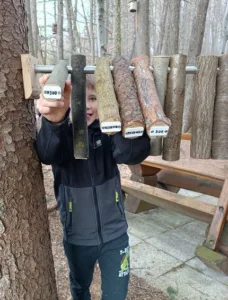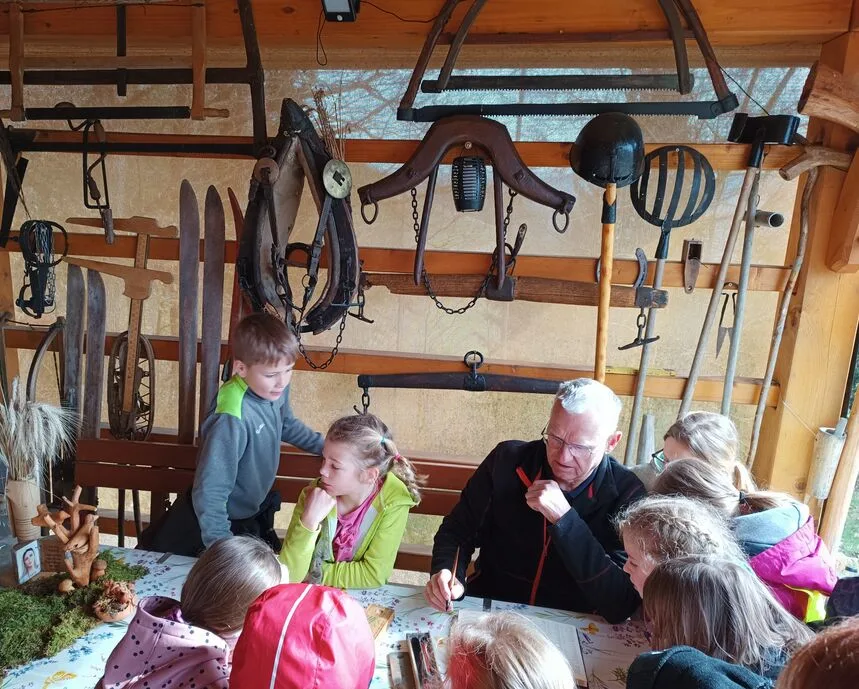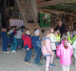 Seznanili smo se z drevesnimi vrstami naših gozdov, tudi ta naravoslovna zbirka se nahaja ob muzejski hiški. Natekali smo se, se skrivali med drevjem in raziskovali mali gozdni raj, ne da bi nas kdo priganjal. Proti poldnevu smo se odpravili nazaj v dolino. Spotoma smo si v gospodarskem poslopju Podstajnške domačije ogledali zbirko rokodelskega in kmetijskega orodja. Izdelale so ga marljive roke naših prednikov, uporabljali so ga prebivalci horjulske doline in okoliških hribov takrat, ko je čas tekel počasneje, ljudje so se še poznali med seboj in hodili drug drugemu v vas.