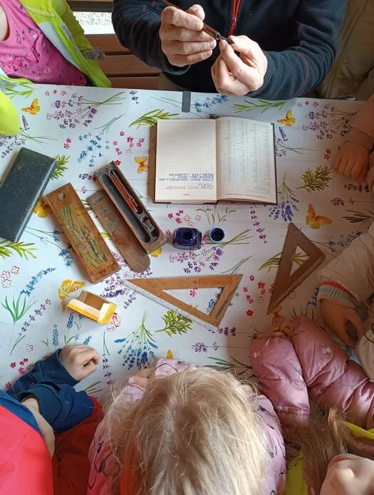 Vsi hitimo, v naglici živimo. Malčki v vrtce, malo večje nožice v šolo, velike v službo. Ker se tako zelo mudi, po opravkih ne hitijo noge, ker so prepočasne, za to poskrbijo hitrejša prevozna sredstva. Ponedeljkovo dopoldne smo horjulski drugošolci zaživeli v duhu časa, ko so se stvari še odvijale v ritmu narave in njenih sprememb. Po jutranji pravljici in okrepčilu, saj po stari modrosti prazna vreča ne stoji pokonci, smo se ob potoku, v katerem zobu časa še kljubujejo kamniti perilniki naših prababic in njihovih prednic, odpravili skozi Horjul. Asfaltirana cesta nas je ob robu vasi popeljala na gozdno pot in se strmo zagrizla v grič. Ob poti smo opazovali pisano preprogo zgodnjega pomladnega gozdnega cvetja, makete slovenskih gora, jaslice in smerokaz pohodnih poti. Na vrhu griča smo se ustavili ob hiški, kjer je naš prijazni vodič Podstajnšk Janez uredil bogato zbirko etno grafskega gradiva s Horjulskega konca. Tudi zanimivosti ob poti so delo njegovih pridnih rok. Z zanimanjem smo si ogledali star pisalni stroj, otroški košek na podstrešju, leseno šolsko peresnico, šest desetletij stare izvode Cicibana. V hiški se našli svoj dom predmeti, ki so včasih bivali v vaških hišah. Spoznali smo pero in peresnik, s kakršnim so svoje prve črke zapisovali prvošolci pred pol stoletja.