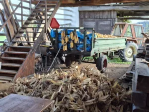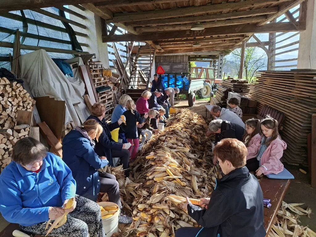 V soboto popoldne se je pod toplarjem Pri Mlinčku zbrala pisana druščina domačinov. Ob mizi s toplimi napitki in domačimi pecivi, ki so jih pripravile vrle gospodinje iz društva, je dišalo po jeseni in domačnosti. Kmalu so se vsi zbrani lotili ličkanja koruze – odstranjevanja zunanjih listov in vezanja v snope, ki so jih nato zložili pod kozolec.