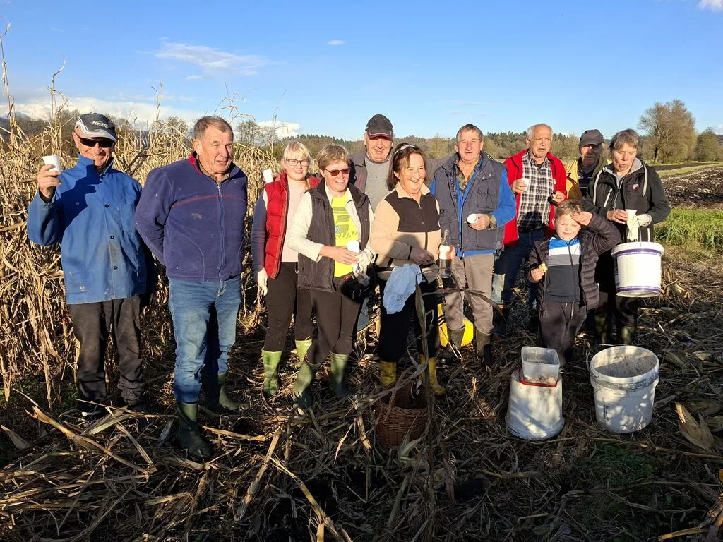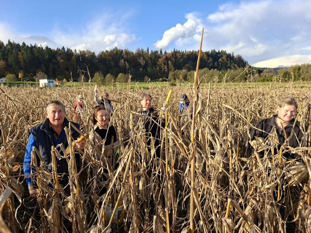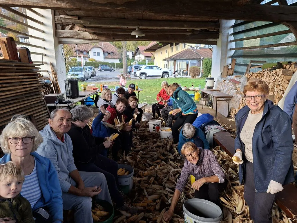 V soboto popoldne se je pod toplarjem Pri Mlinčku zbrala pisana druščina domačinov. Ob mizi s toplimi napitki in domačimi pecivi, ki so jih pripravile vrle gospodinje iz društva, je dišalo po jeseni in domačnosti. Kmalu so se vsi zbrani lotili ličkanja koruze – odstranjevanja zunanjih listov in vezanja v snope, ki so jih nato zložili pod kozolec.