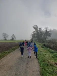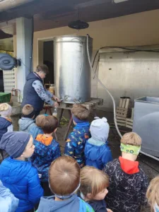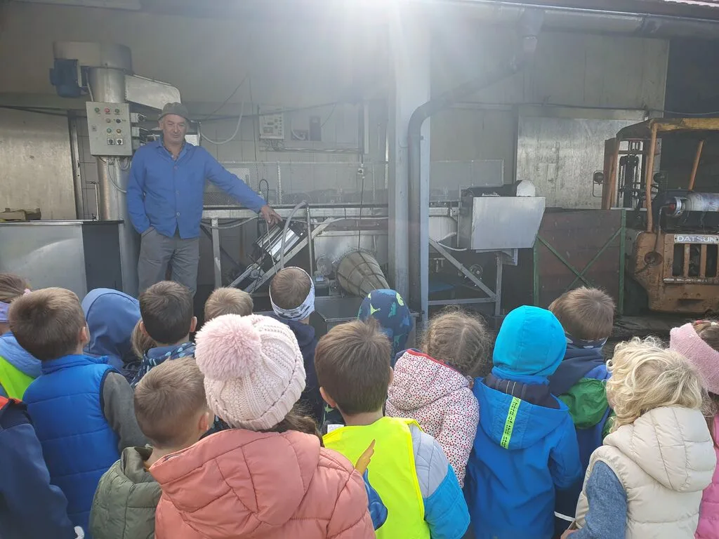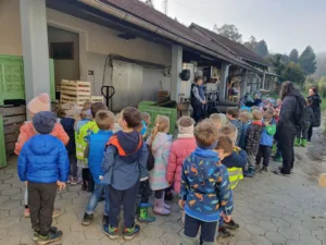 Ko pride jesen, v vrtcu že nestrpno pričakujemo dan, ko se bomo lahko odpravili na sprehod do Lesnega Brda, kjer bomo na sadjarstvu Janša poskusili sveže stisnjen jabolčni sok in krhlje sočnih jabolk. V torek, 8. 10. 2025, smo otroci iz skupin Murni, Čebele in Metulji zakorakali v megleno jutro in po slabi uri hoje prispeli na Lesno Brdo, kjer sta nas na svoji kmetiji pričakala Mojca in Janez Janša. Povedala sta nam nekaj zanimivih informacij o njihovih nasadih, jabolkih in vremenu, ki jim je letos kar močno zagodlo, potem pa sta nas povabila na ogled stroja, ki iz jabolk iztisne jabolčni sok. Kar težko je bilo obdržati varnostno razdaljo, ko je stroj jabolka mlel in majhne koščke jabolk pošiljal po tekočem traku ter iz njih iztiskal svež jabolčni sok. Ko je stroj nehal mleti, smo si lahko privoščili sveže stisnjen jabolčni sok ali mošt in na krhlje narezana jabolka. S polnimi in nasmejanimi usti smo se nastavljali soncu in uživali v jabolčni gostiji. Sadjarstvu Janša se zahvaljujemo za prijazen in velikodušen sprejem na njihovi kmetiji, predvsem pa slastna jabolka in odličen jabolčni sok.