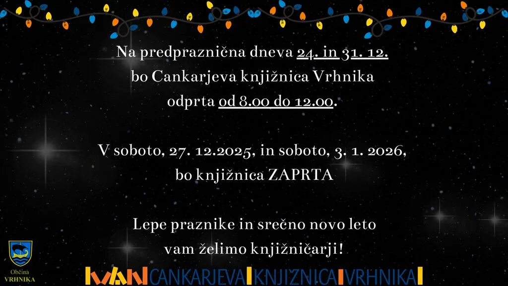 Na predpraznična dneva 24. 12. in 31. 12. 2025 bo knjižnica odprta od 8.00 do 12.00. V soboto, 27. 12. 2025, in soboto, 3. 1. 2026, bo knjižnica ZAPRTA. V času, ko je knjižnica zaprta, lahko gradivo vrnete v knjigomat, ki je nameščen v pritličju Kulturnega centra Vrhnika in v zabojnik, ki je nameščen pred enoto knjižnice v Borovnici. Gradivo si lahko predhodno naročite in ga prevzamete v paketnikih na Vrhniki in v Borovnici tudi v času, ko je knjižnica zaprta.