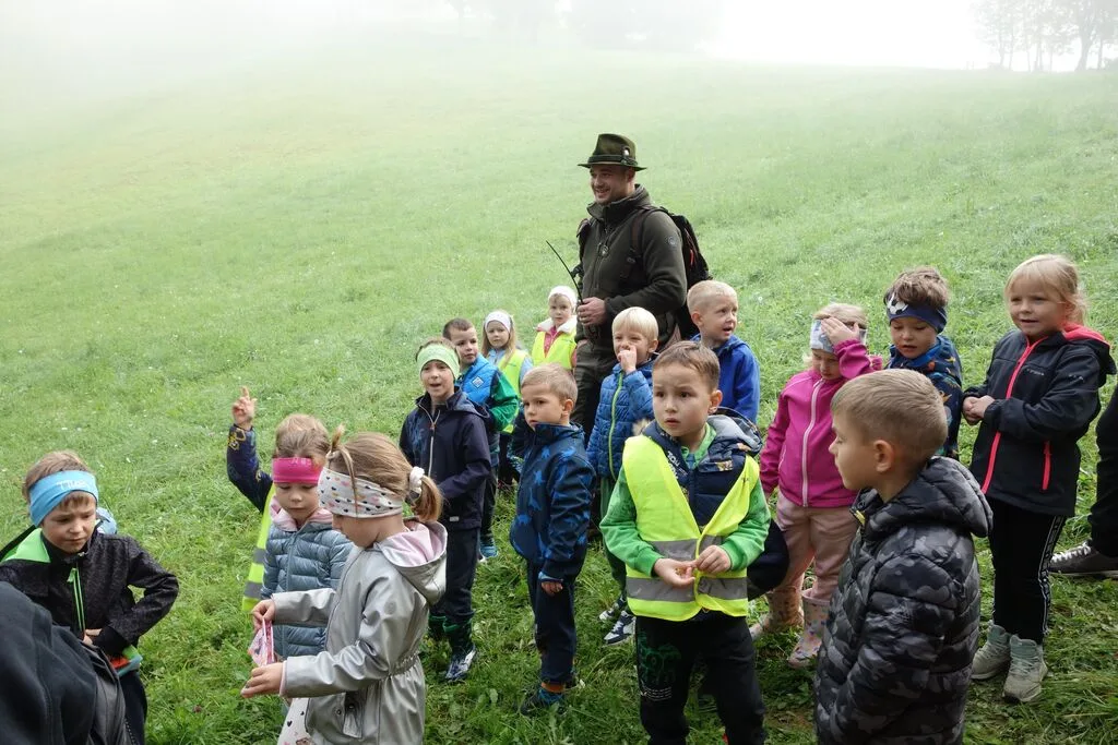 Skozi meglice so sijali sončni žarki. Kolona otrok se je tiho premikala po gozdni poti, slišalo se je drobne kamenčke, ki so škripali pod nogami. Sem in tja so kapljice padale z vlažnih vej. V daljavi sta stali dve postavi, zraven pa so mirno stali trije psi. Pohiteli smo, kar malce stekli, saj smo komaj čakali, da se v gozdu srečamo z lovci. Na nas sta čakala lovca Klemen in Gašper s svojimi lovskimi psi Ado, Rubi in Taro. Po veselem pozdravu smo se pogovorili o pravilih, ki se jih držimo v gozdu. Še dobro, da smo večkrat v gozdu in poznamo gozdni bonton. Zanimivo je bilo poslušati govorico, značilno za lovski stan. Lovca sta nam namreč dala navodilo, da poiščemo stečino, kar pomeni stezo po kateri hodi divjad. Namignila sta nam, da sta na poti opazila zanimive sledi divjadi. Malo naprej smo jih res odkrili, otroci so z malo preudarjanja o tem, katera žival je to, prišli do ugotovitve, da je to jazbečeva sled. V bližini pa smo našli tudi stečino. Lovec Klemen je otrokom pokazal, da ima v nahrbtniku posebne pripomočke s katerimi bo opremil psa. Psički Ada in Rubi sta že nestrpno cvilili, saj sta vedeli kaj sledi. Obe sta dobili ovratnico z oddajnikom, ki lovcu ves čas kaže položaj, kje se psa nahajata. Dobili sta nalogo, na katero sta komaj čakali – po stečini sta stekli za vonjem divje živali, mi pa smo ostali na mestu in poslušali, kako psički vznemirjeno cvilita in lajata. Kar nekaj minut sta krožili daleč po gozdu in slišali smo njuno »zvonjenje«, obenem pa spremljali na sprejemniku, kje sta. Otrokom se je zazdelo, da gonita zajca ali pa srno. Nato je lovec zapiskal na piščalko in psički sta pritekli na stojišče. Nista prignali nobene živali, vseeno pa je bilo vznemirljivo pričakovati, kaj se bo prikazalo iz gozda ter opazovati, kje sta psa.