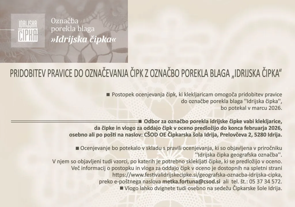 Odbor za označbo porekla idrijske čipke vabi klekljarice, da čipke in vlogo za oddajo čipk v oceno predložijo do konca februarja 2026, osebno ali po pošti na naslov: CŠOD OE Čipkarska šola Idrija, Prelovčeva 2, 5280 Idrija.