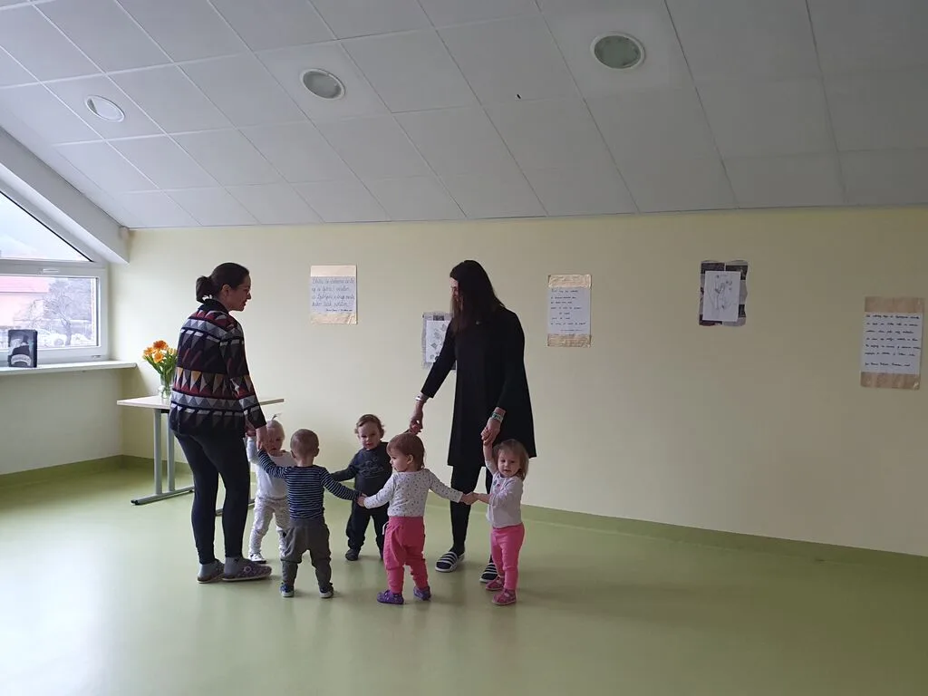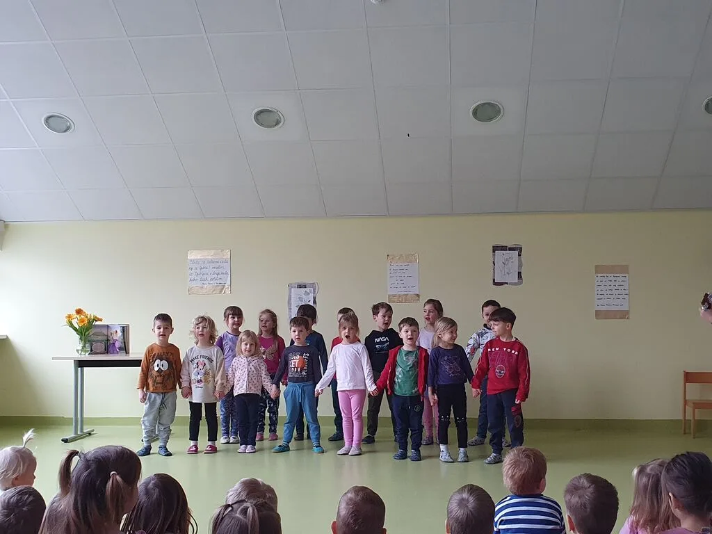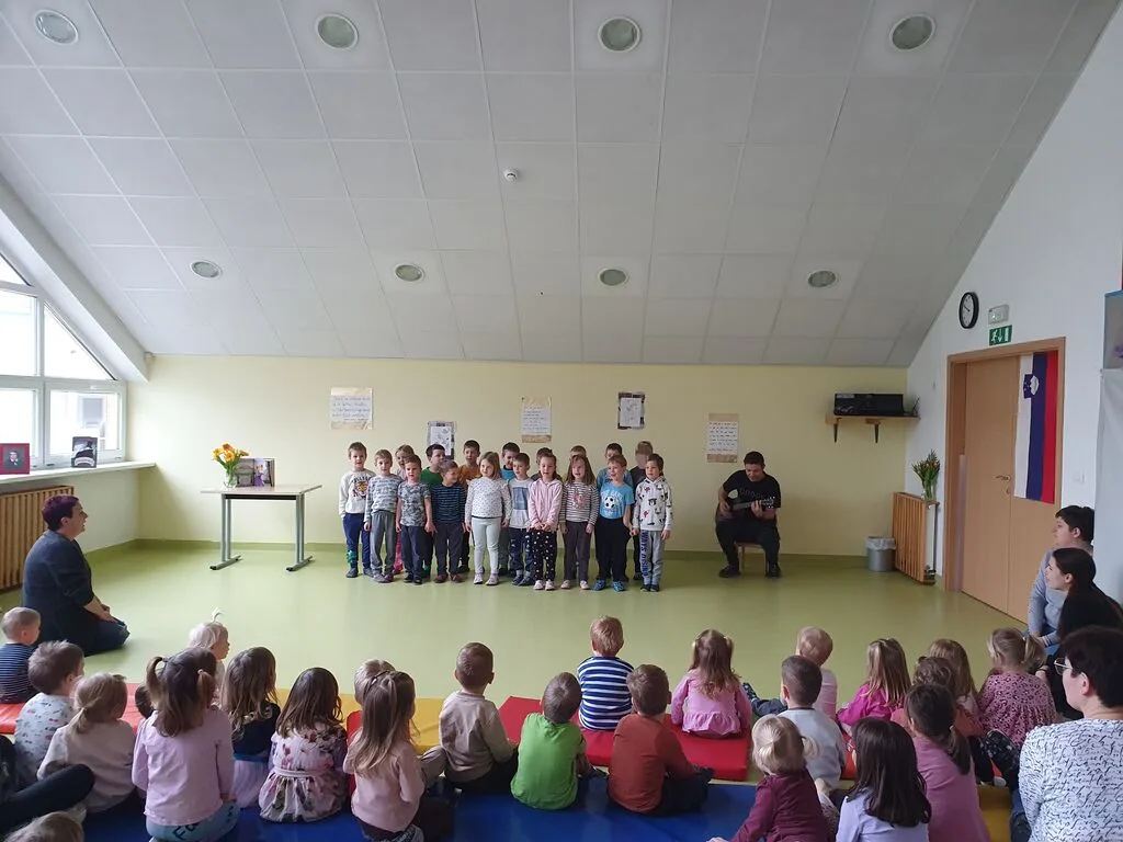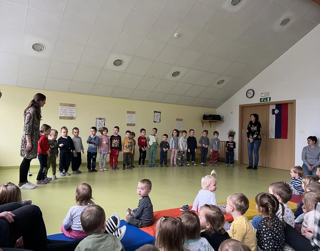 Prireditev smo pričeli s slovensko himno, ki so ji otroci pozorno prisluhnili, po njej pa so na oder najprej prišli najmlajši otroci, ki so nam dobro voljo prinesli z bibarijami in plesom. Otroci iz skupine Gosenice so nam pokazale bibarijo Biba, buba, baja. Nastopa otrok iz skupin Črmlji in Mravlje sta bila čisto v stilu z vremenom, saj so nam eni zaplesali bibarijo Dežek pada in drugi Dežek. Tudi otroci iz skupin Žabice in Kresnice so letos plesali. Žabice ob pesmi Mi se imamo radi, Kresnice pa ob pesmi Pleši, pleši črni kos. Plesne korake so nato zamenjale rime iz pesmi Sedem lisičic, ki so jo deklamirali otroci iz skupine Pikapolonice in zvok kitare, ob kateri so otroci iz skupine Čebele zapeli Pesmico o snegu. Tudi otroci iz skupine Murni se še niso popolnoma poslovili od snega in so z deklamacijo pesmi Stopinje v našo telovadnico priklicali razigrane škratke. Najstarejši otroci iz skupine Metulji pa so v pravem zborčku ubrano zapeli pesem Zvezdice bele.