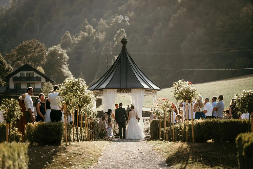 Daleč stran od mestnega vrveža in gneče, obdan z okoliškimi hribi, leži graščinski kompleks, ki ponuja popoln prostor za izvedbo poročnega obreda. Ob lepem vremenu je na voljo park v francoskem slogu, skozi katerega mimo Neptunovega vodnjaka vodijo peščene stezice. Do paviljona obdanega s cvetočimi vrtnicami zakorakajte v spremstvu izbrane glasbe. Voščila, čestitke in prve zdravice naj odmevajo pod krošnjo mogočne stoletne lipe, kjer vam po želji pripravimo prostor za sprejem in pogostitev.