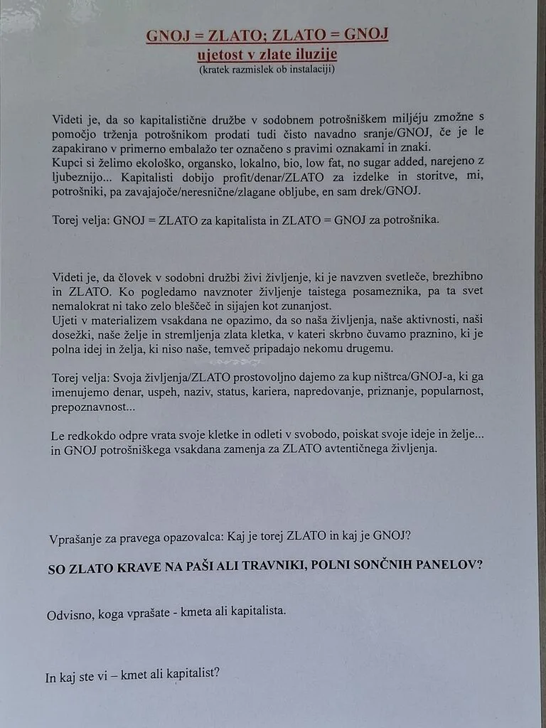 Čeprav se umetnica ukvarja predvsem s slikanjem in risbo, pa se je tokrat preizkusila v oblikovanju instalacije s pomenljivim naslovom Ujetost v zlate iluzije. Njeno delo temelji na raziskovanju ter uporabi rabljenih, zavrženih, odpadnih, »neumetniških« materialov in najdenih predmetov; le-ti so v likovni kompoziciji, ki je na ogled, dobili popolnoma nov videz in pomen. Vsebinsko se je lotila tem, povezanih okoljsko problematiko, trajnostnim razvojem in umeščenostjo človeka v sodobno potrošniško družbo. Njeno delo spremlja tudi kritičen razmislek o navedenih temah, ki ga avtorica zaključi s provokativnim vprašanjem za gledalca, ki naj (se) odloči, kaj je (zanj) zlato in kaj je gnoj: »So zlato krave na paši ali travniki, polni sončnih panelov?«