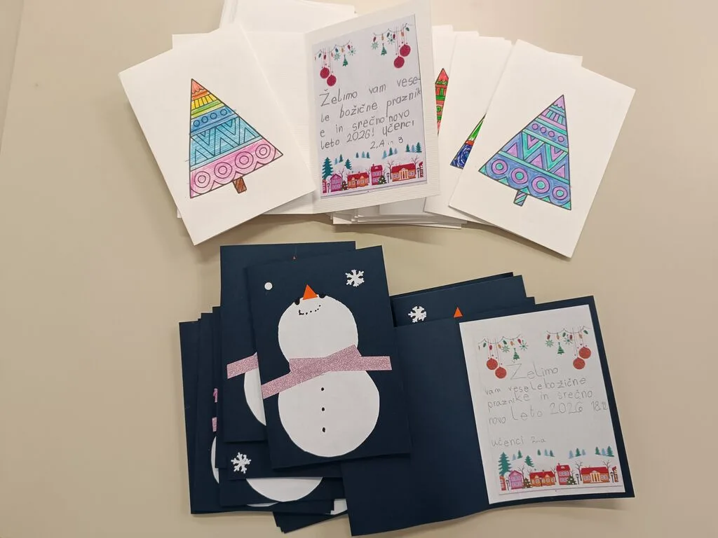 Horjulski drugošolci smo v novembru razmišljali o drobnih pozornostih, ki lepšajo naš vsak dan. Na našem tehniškem dnevu, ko smo si okrasili učilnico v zimskem vzdušju, smo izdelovali tudi voščilnice. Eno za domače in dve za varovance doma ostarelih v našem kraju.