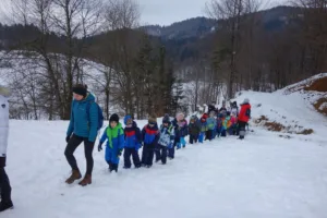 Tako smo se v torek, 13. 1., odpravili na zimski pohod. Takoj zjutraj po zajtrku so se otroci iz skupin Metulji, Murni in Čebele v garderobi oblekli zimi primerno, vzeli vsak svoj nahrbtnik s pijačo in pripravljeni čakali, da odidemo na pohod. Pred vrtcem so nas že pričakovali štirje predstavniki Planinskega društva Horjul, ki so se skupaj z nami odpravili na pot.