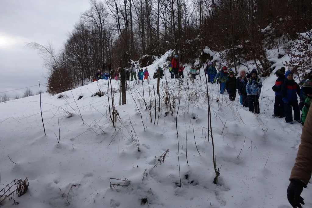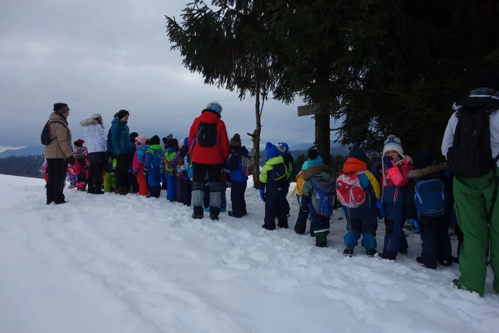 Pot nas je vodila čez Ljubgojno mimo Kuclja, kjer smo se že preizkusili v hoji po ledu. Po zamrznjenem snegu smo se nato v koloni podali skozi Zgornjo Tičnico, na Kaptanov grič in od tam na Oblakov grič ter skozi gozd na Staje, kjer smo imeli čas za manjši prigrizek. Od tu smo se po snegu naprej podali nad cesto, ki pelje v Zagorico, nato pa smo se ponovno povzpeli do gozda Tičnice in se čez hrib vrnili nazaj v vrtec.