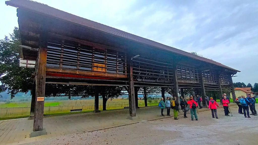 Pri enem največjih kozolcev v Sloveniji, ki je občinski prireditveni prostor (zanimivo, kajne), smo se ustavili, si ga ogledali in občudovali, nato krenili peš do manjšega Braslovškega jezera, ki je nastalo leta 1961 z zajezitvijo potoka Trebnik, se sprehodili po sprehajalni poti okrog, nato pa se odpeljali proti Žovneškemu jezeru (49 ha), ki je nastalo leta 1978, ko so na potoku Trnovec postavili visoko pregrado zaradi poplavne varnosti in akumulacije vode za namakanje ter gojitev rib. Razgibana gričevnata pokrajina pod obronki planote Dobrovlje gosti številne posamezne kmetije z arhitekturno zanimivimi gospodarskimi in bivalnimi prostori (kozolci, kašče hiše…).
