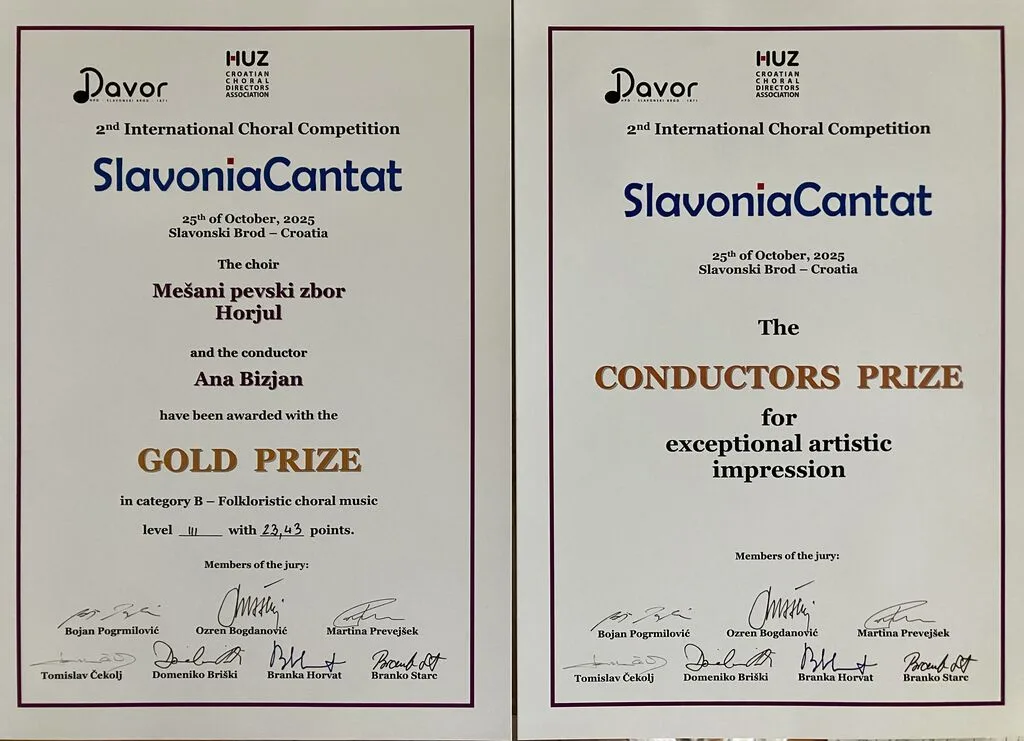 Mešani pevski zbor PD Horjul je 25. oktobra pod vodstvom Ane Bizjan sodeloval na 2. mednarodnem zborovskem tekmovanju Slavonia Cantat v Slavonskem Brodu na Hrvaškem. Na tekmovanju je sodelovalo 23 zborov iz Hrvaške, eden Srbije in dva iz Slovenije. Mešani pevski zbor PD Horjul je v kategoriji ljudska glasba prejel zlato priznanje in posebno priznanje za dirigenta. Zbor se je v Slavonski Brod odpravil v zgodnjih jutranjih urah. Po tonski vaji in spoznavanju odra je sledil tekmovalni del, kjer so se predstavili s štirimi priredbami slovenskih ljudskih pesmi. Po tekmovanju je sledilo skupno kosilo in ogled mesta. Po sklepnem, večernem delu tekmovanja in razglasitvi rezulatov so se člani zbora polni lepih vtisov odpravili proti domu. Za pevce in zborovodkinjo priznanji pomenita potrditev dobrega dela na vajah, kjer so se pevci na tekmovanje skrbno pripravljali od začetka sezone.